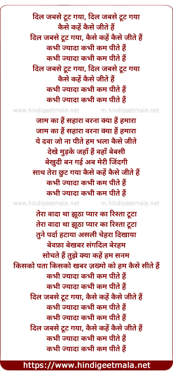 Lyrics of Dil Jabse Tut Gaya, Kaise Kahe Kaise Jite Hai - दिल जबसे टूट गया, कैसे कहें कैसे जीते हैं