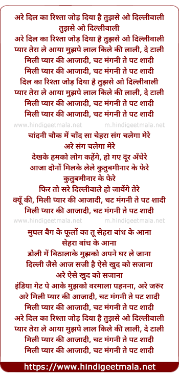 Lyrics of Dil Ka Rishta Jod Diya Hai Tujhase O Dilliwaali - दिल का रिश्ता जोड़ दिया है तुझसे ओ दिल्लीवाली