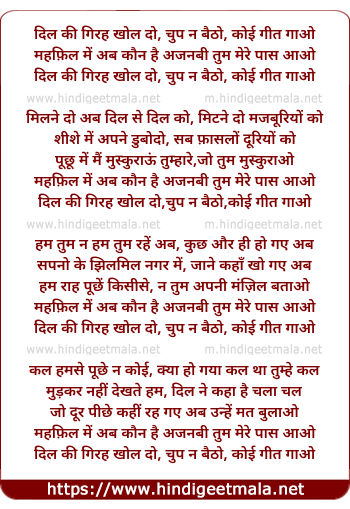 Dil ki girah khol do, chup na baitho koi geet gao, aa aa mahefil ab kaun hai ajnabi tum mere paas aao, dil ki girah hol do ... kal humse poonche na koi, kya ho gaya tha tumhe kal, mood kar nahi dekhte hum, dil ne kahan hai chal aa chal, jo door peeche rahe gaye ab uneh mat bulao, mahefil mei ab kaun hai ajnabi tum mere paas aao, dil ki girah khol do ...