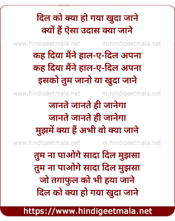 Lyrics of Dil Ko Kya Ho Gaya Khuda Jane - दिल को क्या हो गया खुदा जाने