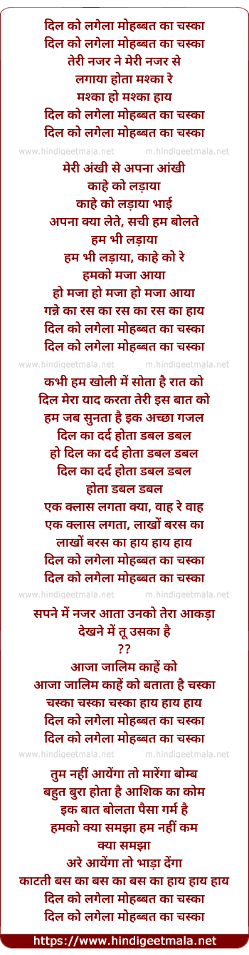 Lyrics of Dil Ko Lagela Mohabbat Ka Chaska - दिल को लगेला मोहब्बत का चस्का