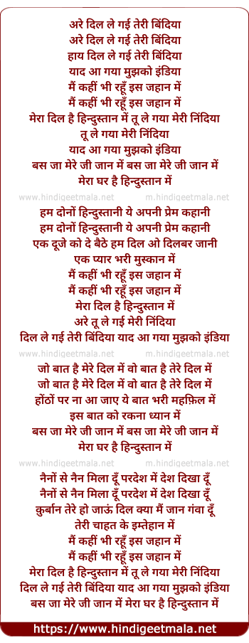 mera dil hai hidustan me tu le gaya meri nindiya