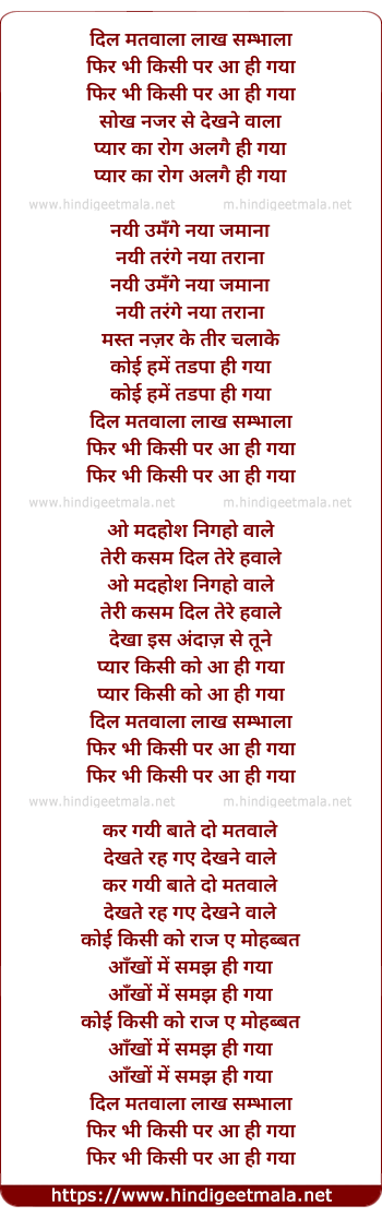 Lyrics of Dil Matwala Lakh Sambhala (Female) - दिल मतवाला लाख सम्भाला