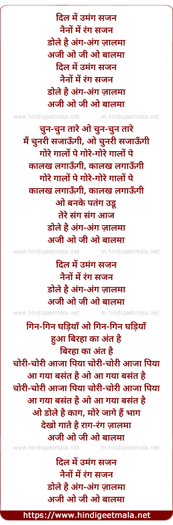 Lyrics of Dil Me Umang Sajan, Naino Me Rang Sajan - दिल में उमंग सजन,नैनों में रंग सजन