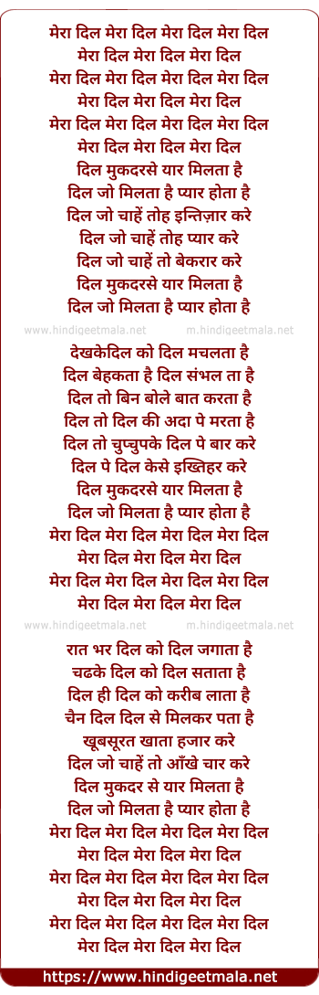 Lyrics of Dil Mera Dil Mera Dil (Ii) - मेरा दिल मेरा दिल मेरा दिल मेरा दिल