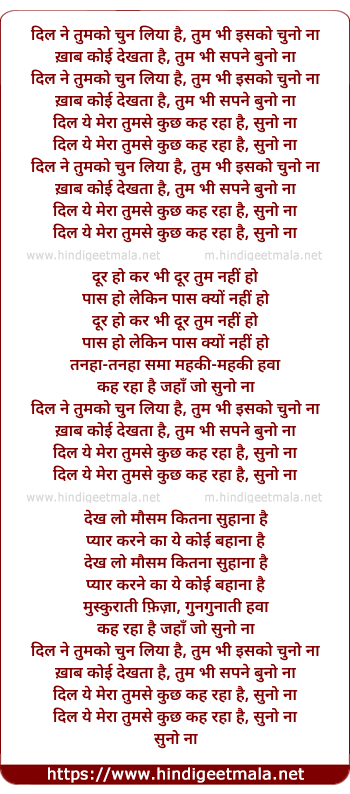 Lyrics of Dil Ne Tum Ko Chun Liya Hai, Tum Bhee Usako Chuno Na - दिल ने तुमको चुन लिया है तुम भी इसको चुनो ना