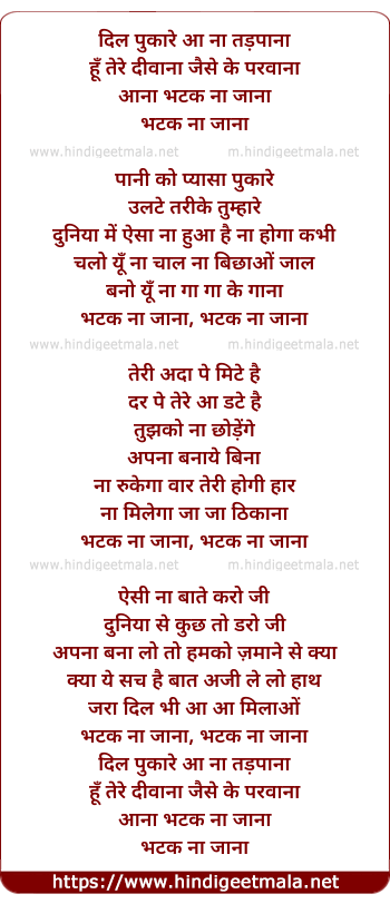 Lyrics of Dil Pukare Aa Na Tadpana - दिल पुकारे आना ना तड़पाना