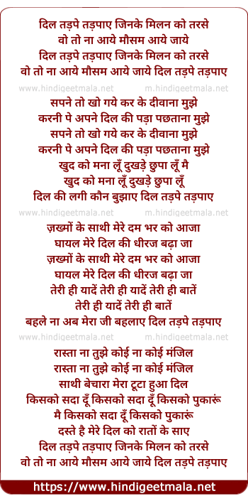 Lyrics of Dil Tadpe Tadpaye - दिल तड़पे तड़पाए