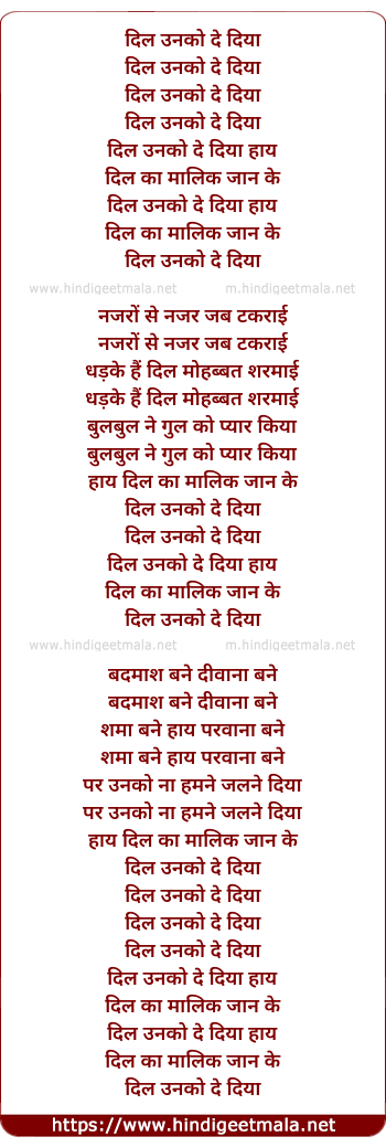 Lyrics of Dil Unko De Diya Haay - दिल उनको दे दिया हाय