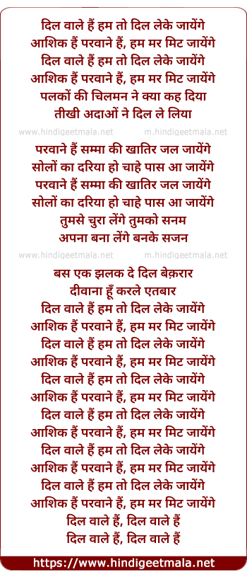 Lyrics of Dil Wale - दिल वाले हैं हम तो दिल लेके जायेंगे