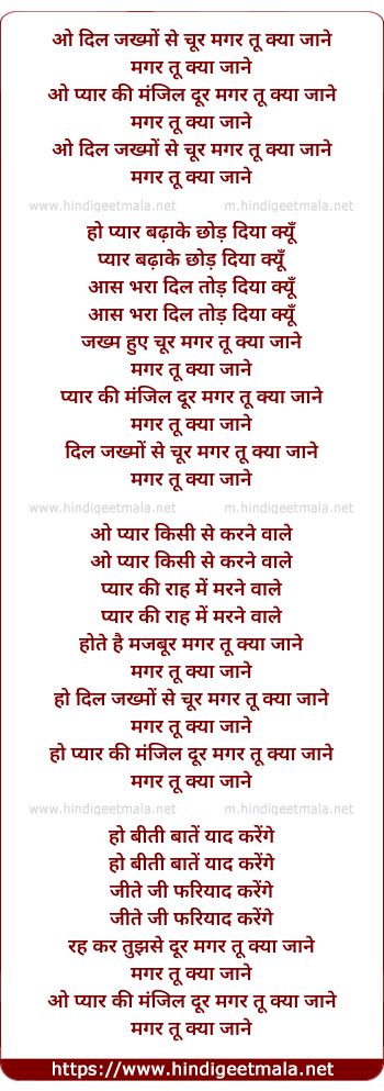 Lyrics of Dil Zakhmo Se Chur Magar Tu Kia Jane - ओ दिल जख्मों से चूर मगर तू क्या जाने