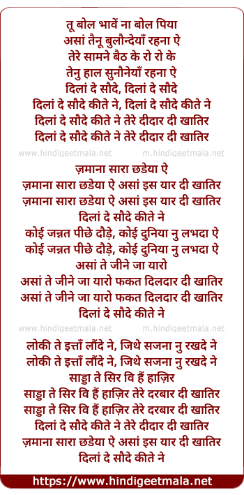 Lyrics of Dilaan De Saudey - दिलां दे सौदे