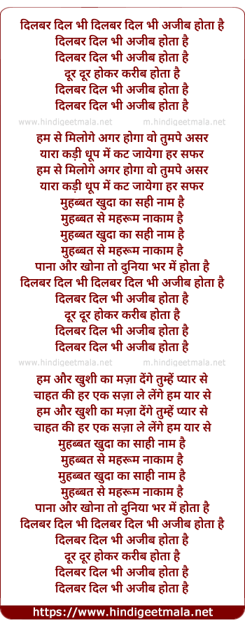 Lyrics of Dilbar Dil Bhi Ajeeb Hota Hai - दिलबर दिल भी दिलबर दिल भी अजीब होता है