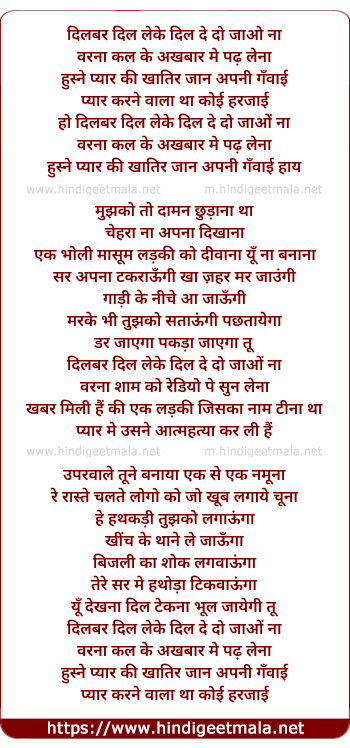 Lyrics of Dilbar Dil Leke Dil De Do - दिलबर दिल लेके दिल दे दो