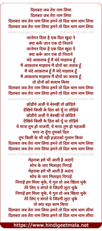 Lyrics of Dilbara Jab Tera Naam Liya - दिलबरा जब तेरा नाम लिया