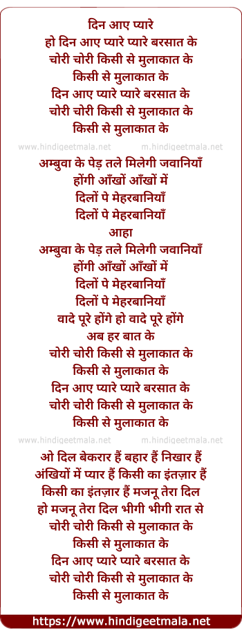Lyrics of Din Aaye Pyare Pyare Barsat Ke, Chori Chori Kisi Se Mulaqat Ke - दिन आए प्यारे प्यारे बरसात के, चोरी चोरी किसी से मुलाकात के