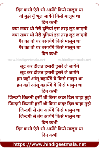 Lyrics of Din Kabhi Aise Bhi Aayenge - दिन कभी ऐसे भी आयेंगे किसे मालूम था