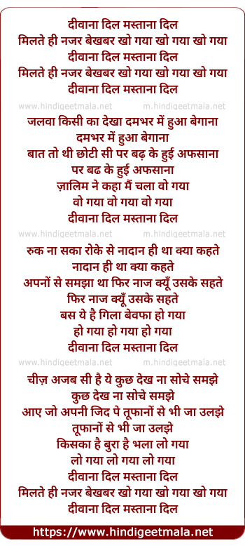 Lyrics of Diwana Dil Mastana Dil - दीवाना दिल मस्ताना दिल