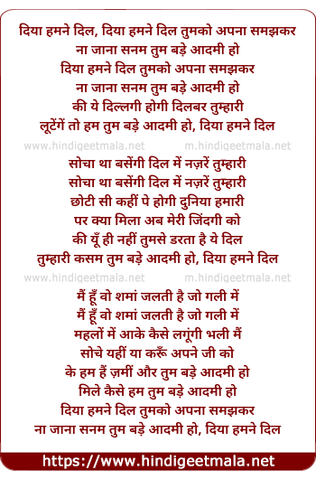 Lyrics of Diya Hamne Dil Tumko Apna Samjhkar - दिया हमने दिल तुमको अपना समझकर