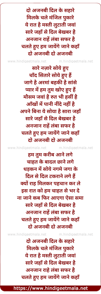 Lyrics of Do Ajnabi Dil Ke Sahaare - दो अजनबी दिल के सहारे
