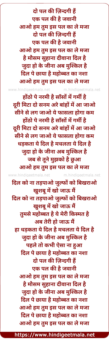 Lyrics of Do Pal Ki Zindagi Hain - दो पल की ज़िन्दगी हैं