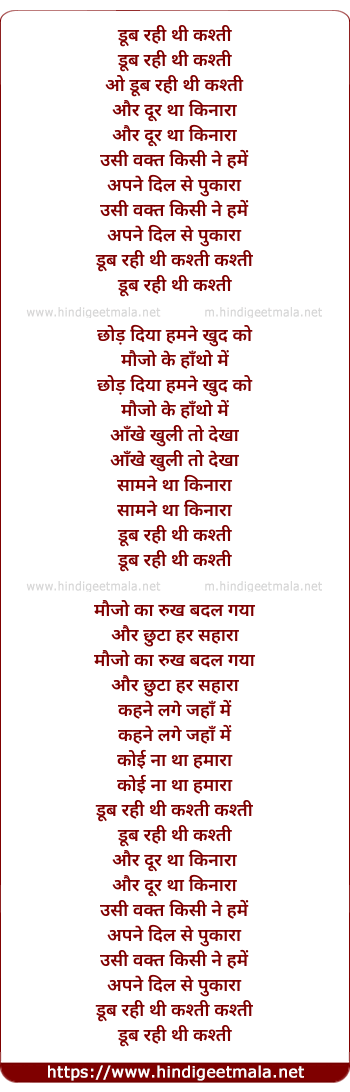 Lyrics of Doob Rahi Thi Kashti - डूब रही थी कश्ती