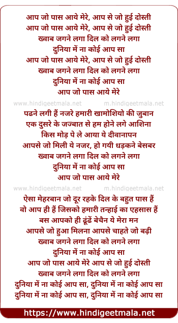 Lyrics of Duniya Me Na Koi Aap Sa - दुनिया में ना कोई आप सा
