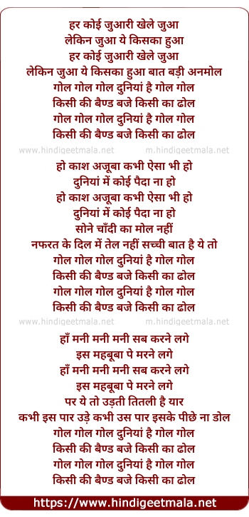 Lyrics of Duniya Hai Gol Gol - दुनियां है गोल गोल