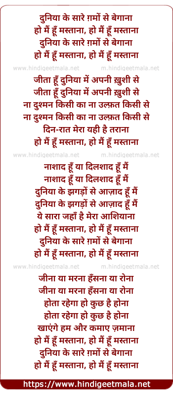 Lyrics of Duniya Ke Sare Ghamo Se Begana - दुनिया के सारे ग़मों से बेगाना