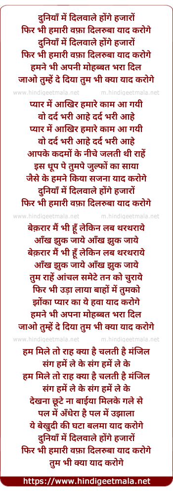 Lyrics of Duniya Me Dilwale Honge - दुनियाँ में दिलवाले होंगे