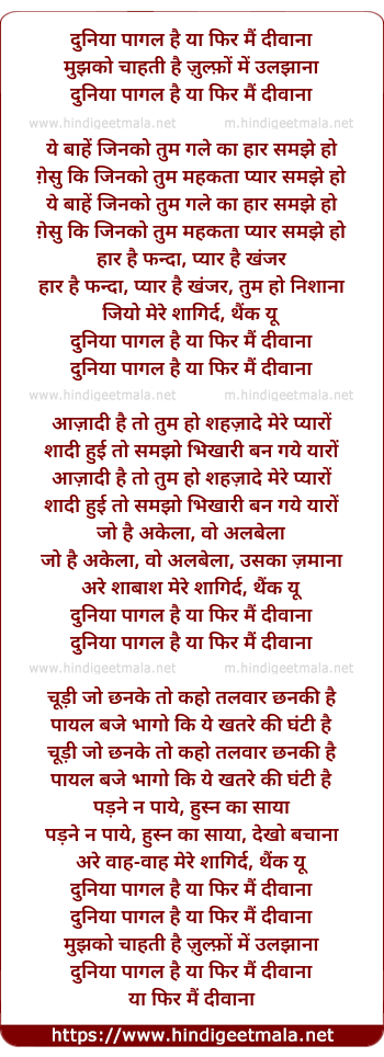 Lyrics of Duniya Pagal Hai, Ya Phir Main Diwana - दुनिया पागल है या फिर मैं दीवाना