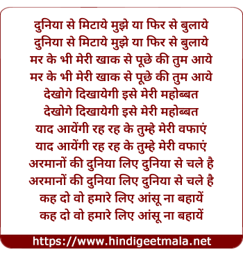 Lyrics of Duniya Se Mitaye Mujhe - दुनिया से मिटाये मुझे या फिर से बुलाये