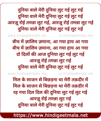 Lyrics of Duniya Wale Meri Duniya Lut Gayi - दुनिया वाले मेरी दुनिया लुट गई