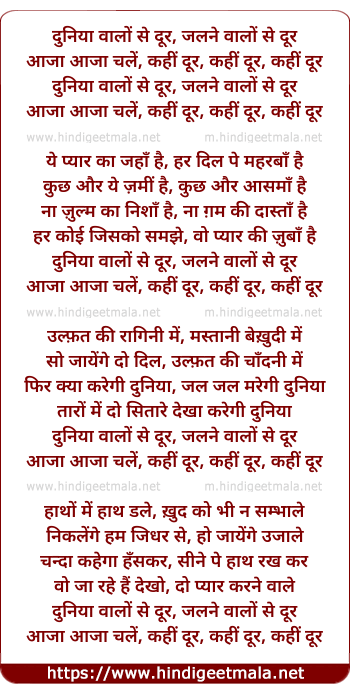 Lyrics of Duniya Walo Se Dur Jalne Walo Se Dur - दुनिया वालों से दूर, जलने वालों से दूर