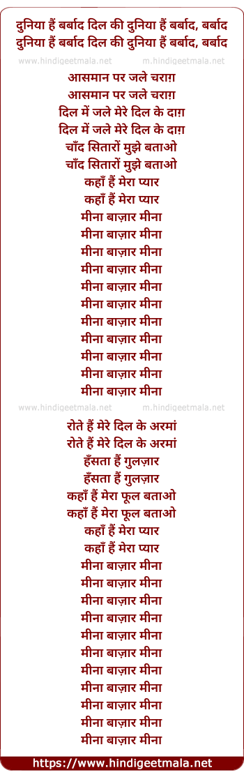 Lyrics of Duniyaa Hai Barabaad Dil Ki, Minaa Baazaar - दुनिया है बरबाद दिल की दुनिया है बरबाद