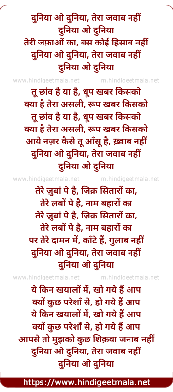 Lyrics of Duniyaa O Duniyaa, Teraa Javaab Nahin - दुनिया ओ दुनिया, तेरा जवाब नहीं