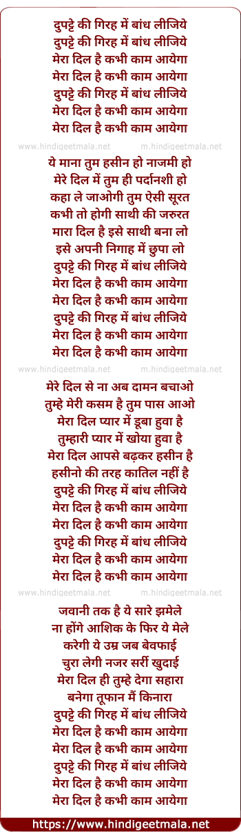 Lyrics of Dupatte Kee Girah Me Bandh Lijiye - दुपट्टे की गिरह में बांध लीजिये