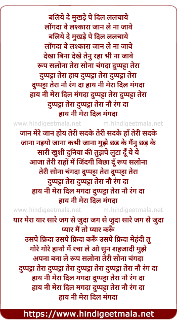 Lyrics of Duppatta Tera Nau Rang Da - दुप्पट्टा तेरा नौ रंग दा