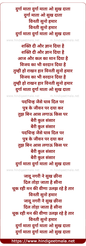 Lyrics of Durga Mata O Sukh Daata - दुर्गा माता दुर्गा माता ओ सुख दाता
