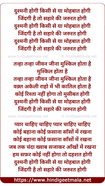 Lyrics of Dushmani Hogi Kisi Se Ya Mohabbat Hogi - दुश्मनी होगी किसी से या मोहबात होगी