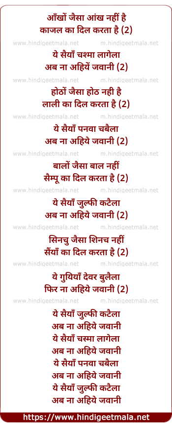 Lyrics of Aye Saiyan Chasma Lagaila Ab Na Aihen Jawani - ऐ सैयां चश्मा लगैला अब ना अइहें जवानी