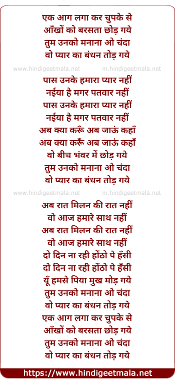 Lyrics of Ek Aag Laga Kar Chupke Se Ankho Ko Barasta Chhod Gaye - एक आग लगा कर चुपके से आँखों को बरसता छोड़ गये