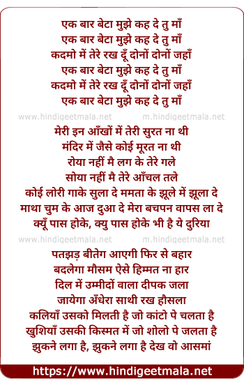 Lyrics of Ek Baar Beta Mujhe - एक बार बेटा मुझे
