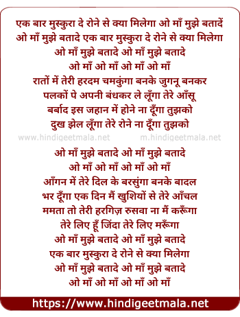 Lyrics of Ek Baar Muskura De Rone Se Kya Milega O Maa Mujhe Bta De - एक बार मुस्कुरा दे रोने से क्या मिलेगा ओ माँ मुझे बता दे