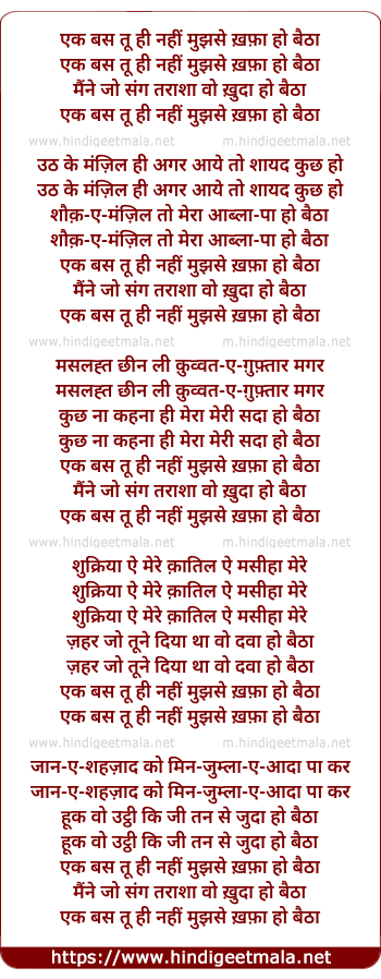 Lyrics of Ek Bas Too Hee Nahee Mujhse Kafa Ho Baitha - एक बस तू ही नहीं मुझसे ख़फ़ा हो बैठा