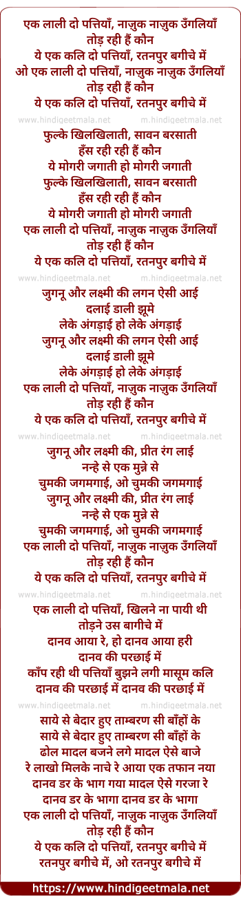 Lyrics of Ek Kali Do Pattiyaa - एक लाली दो पत्तियाँ, नाज़ुक नाज़ुक उँगलियाँ