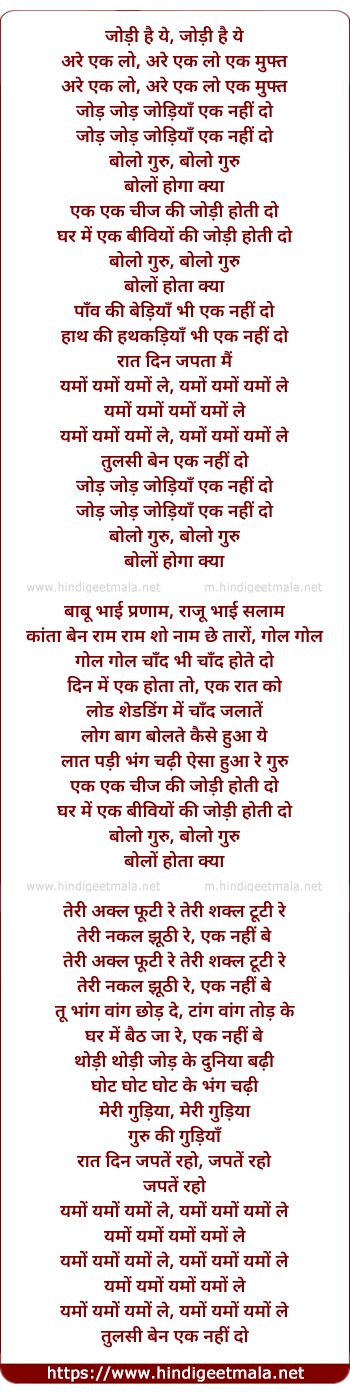 Lyrics of Ek Lo Ek Muft.. Jod Jod Jodiya - एक लो एक मुफ्त.. जोड़ जोड़ जोड़ियाँ