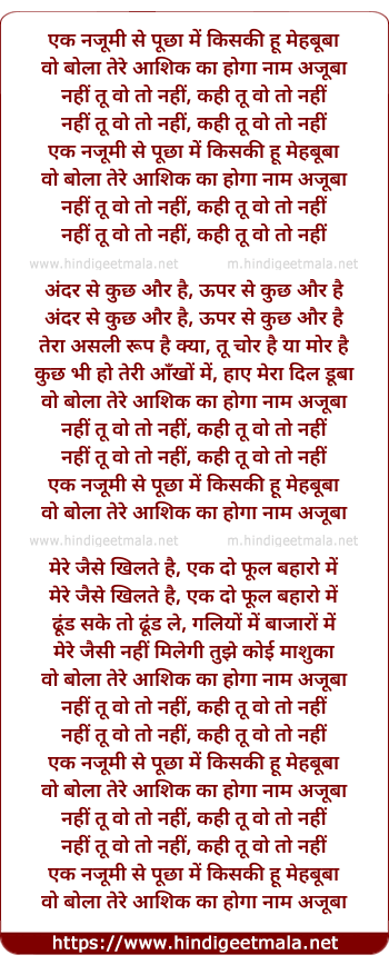 Lyrics of Ek Najumi Se Pucha, Me Kiski Hu Mahbuba - एक नजूमी से पूछा, मैं किसकी हूँ मेहबूबा