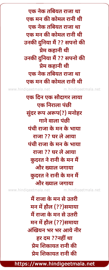 Lyrics of Ek Nek Tabiyat Raja Tha, Ek Man Ki Komal Rani Thi - एक नेक तबियत राजा था ,एक मन की कोमल रानी थी