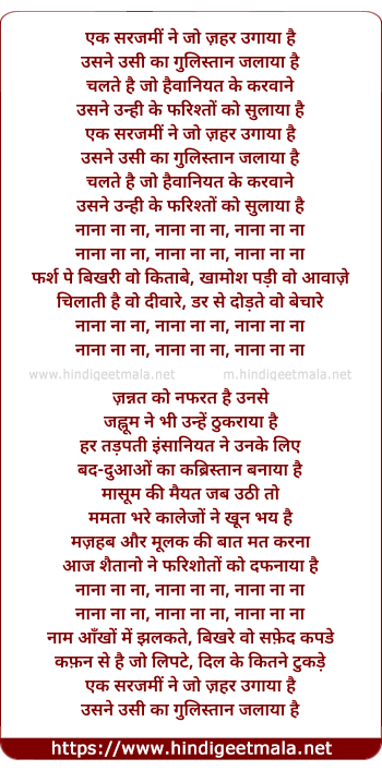 Lyrics of Ek Sarzameen - एक सरजमीं ने जो ज़हर उगाया है